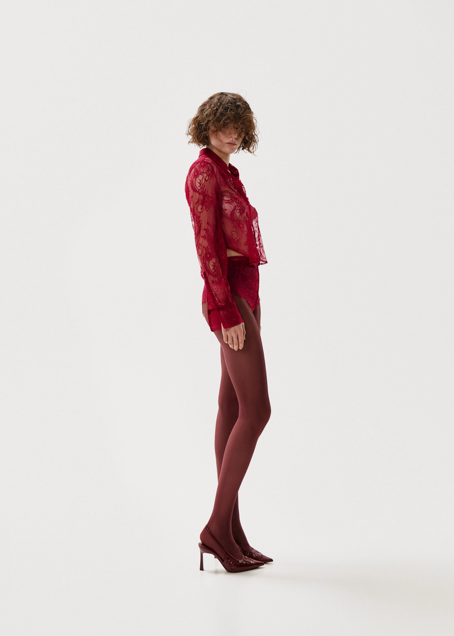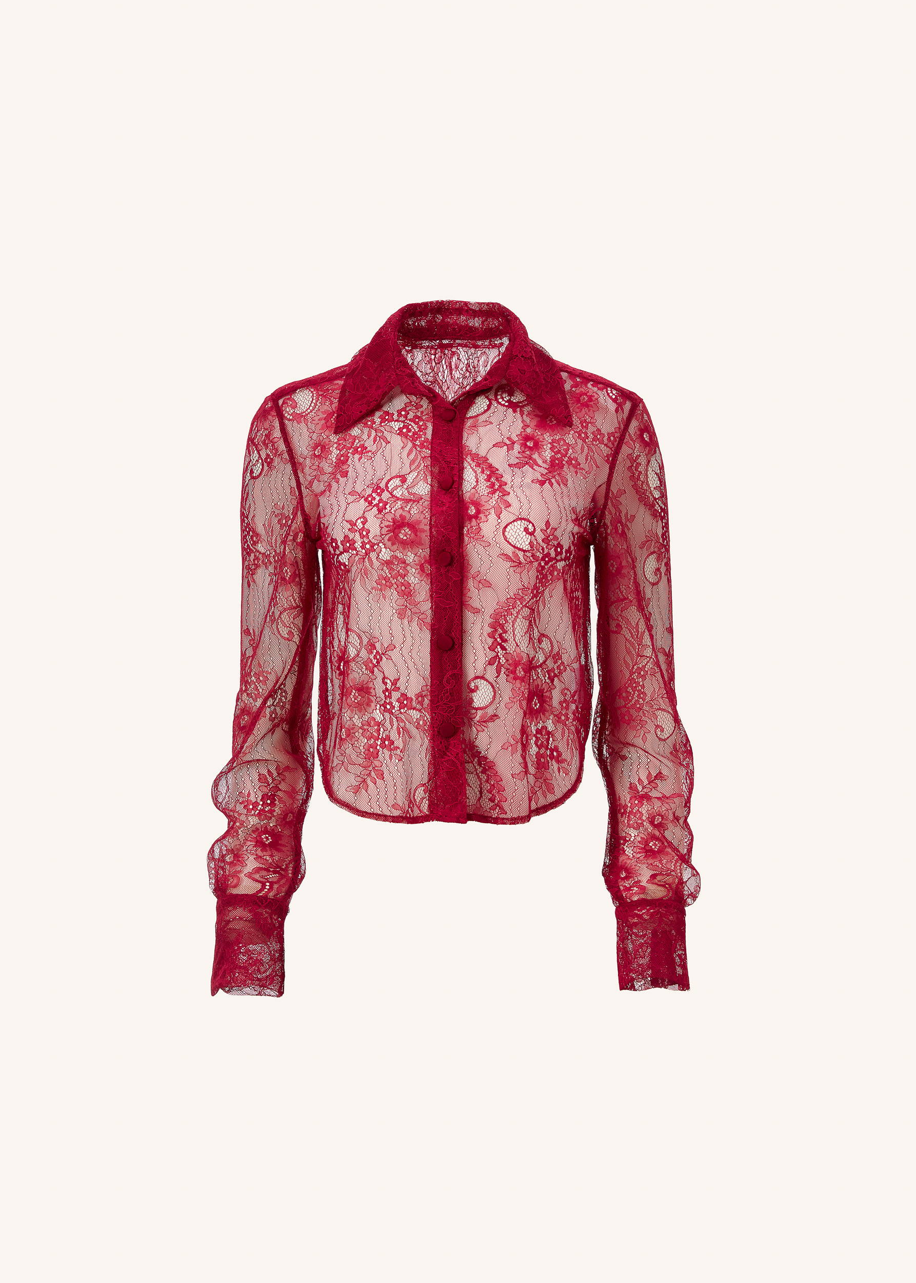 Sheer lace shirt in blood red, is fitted and has short length, with long sleeves and buttoned front. The lace is fluid and soft.