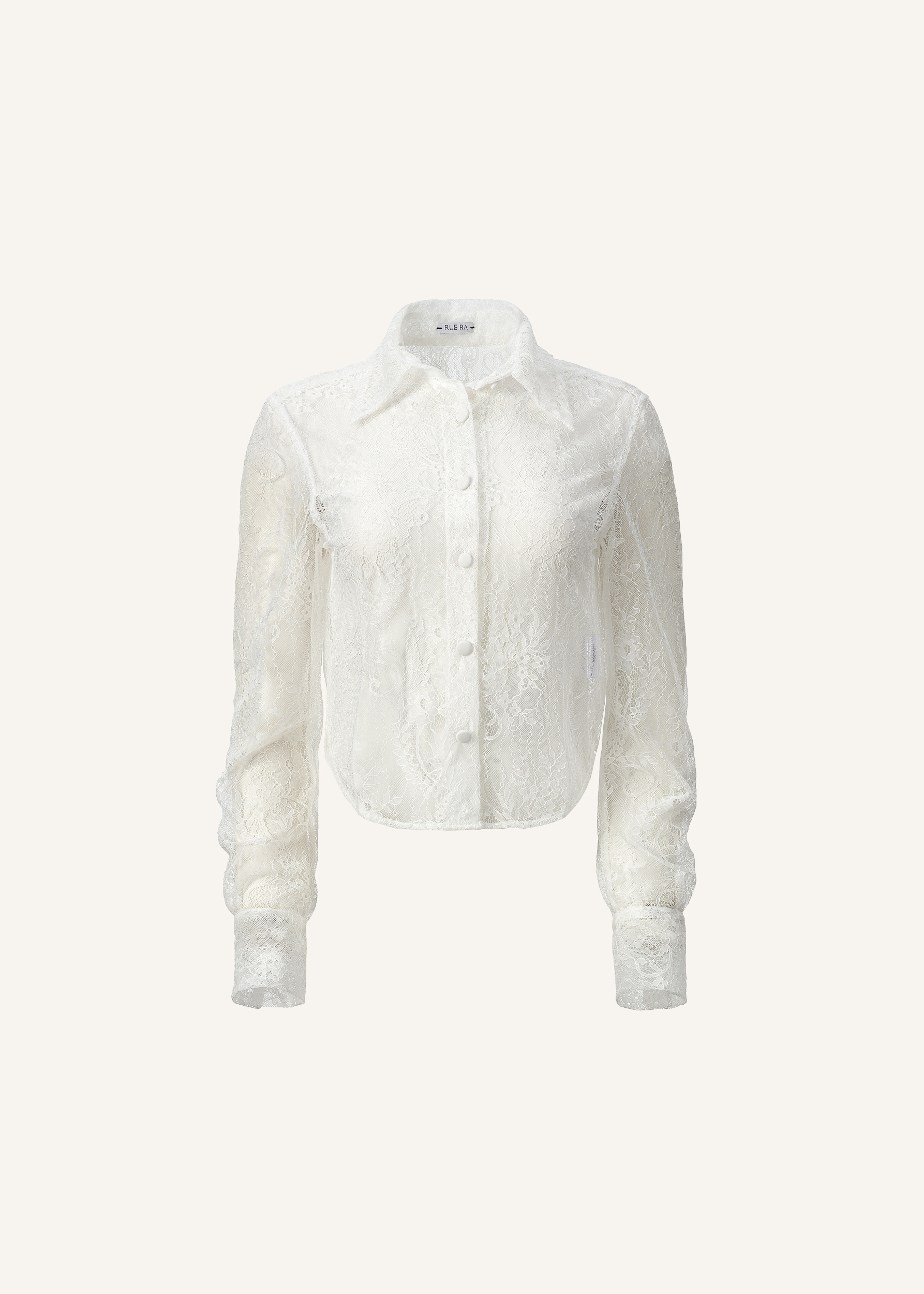 Sheer lace shirt in white, is fitted and has short length, with long sleeves and buttoned front. The lace is fluid and soft.