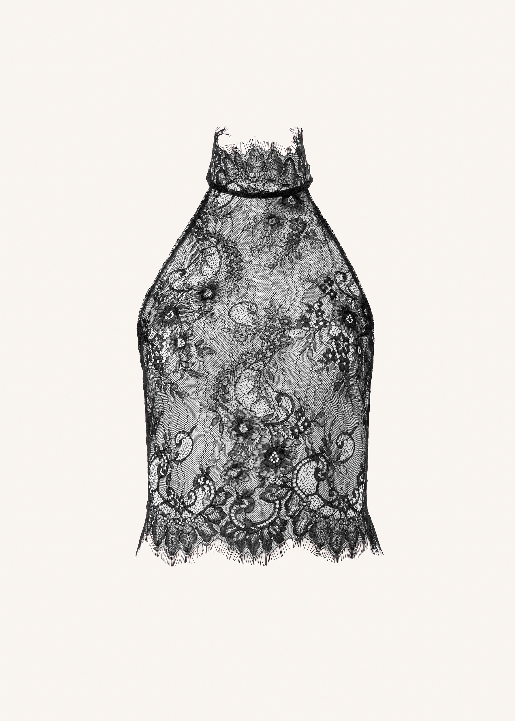 Sheer lace halter-neck top in black, with high neck, open back, sleeveless and buttoned fastening in the back.