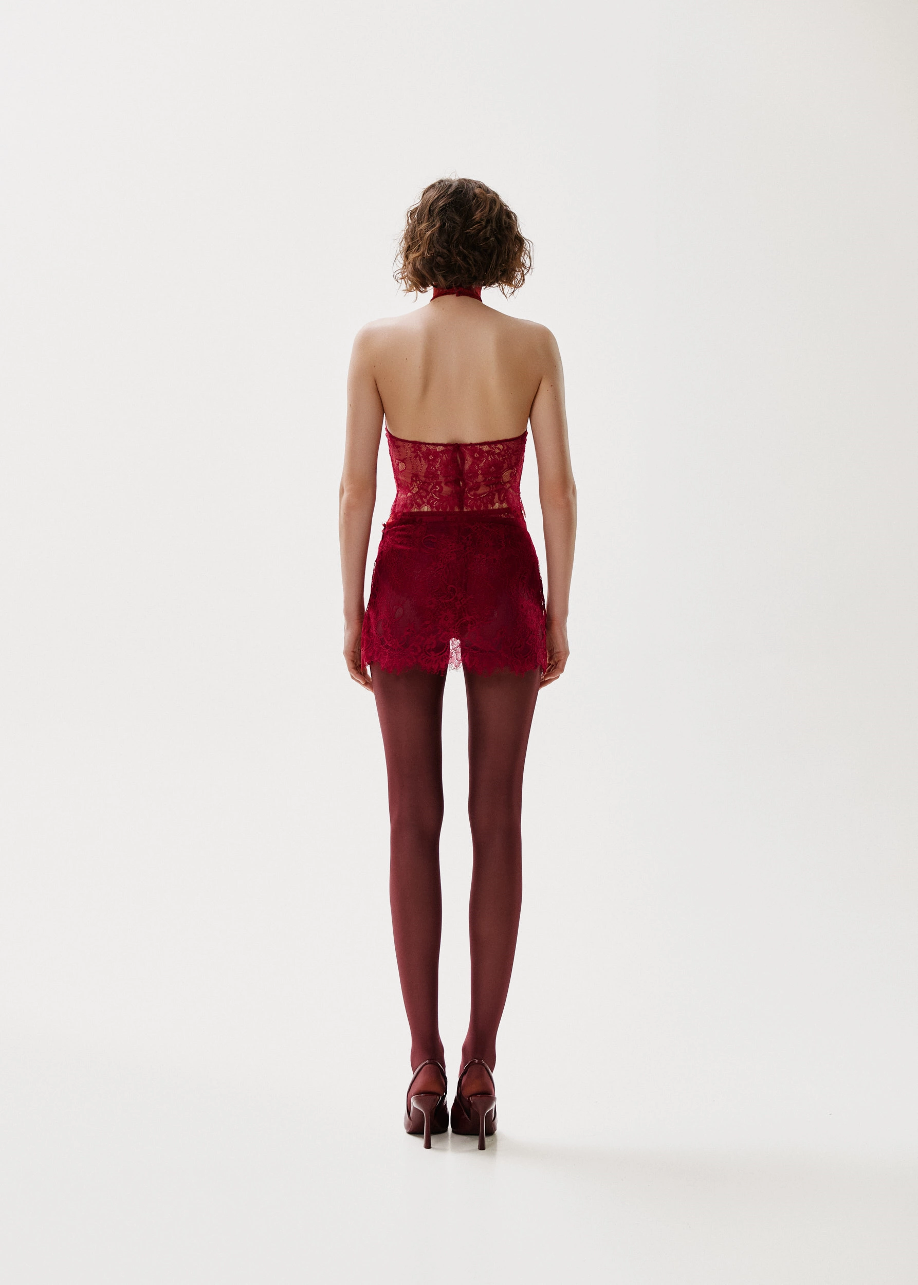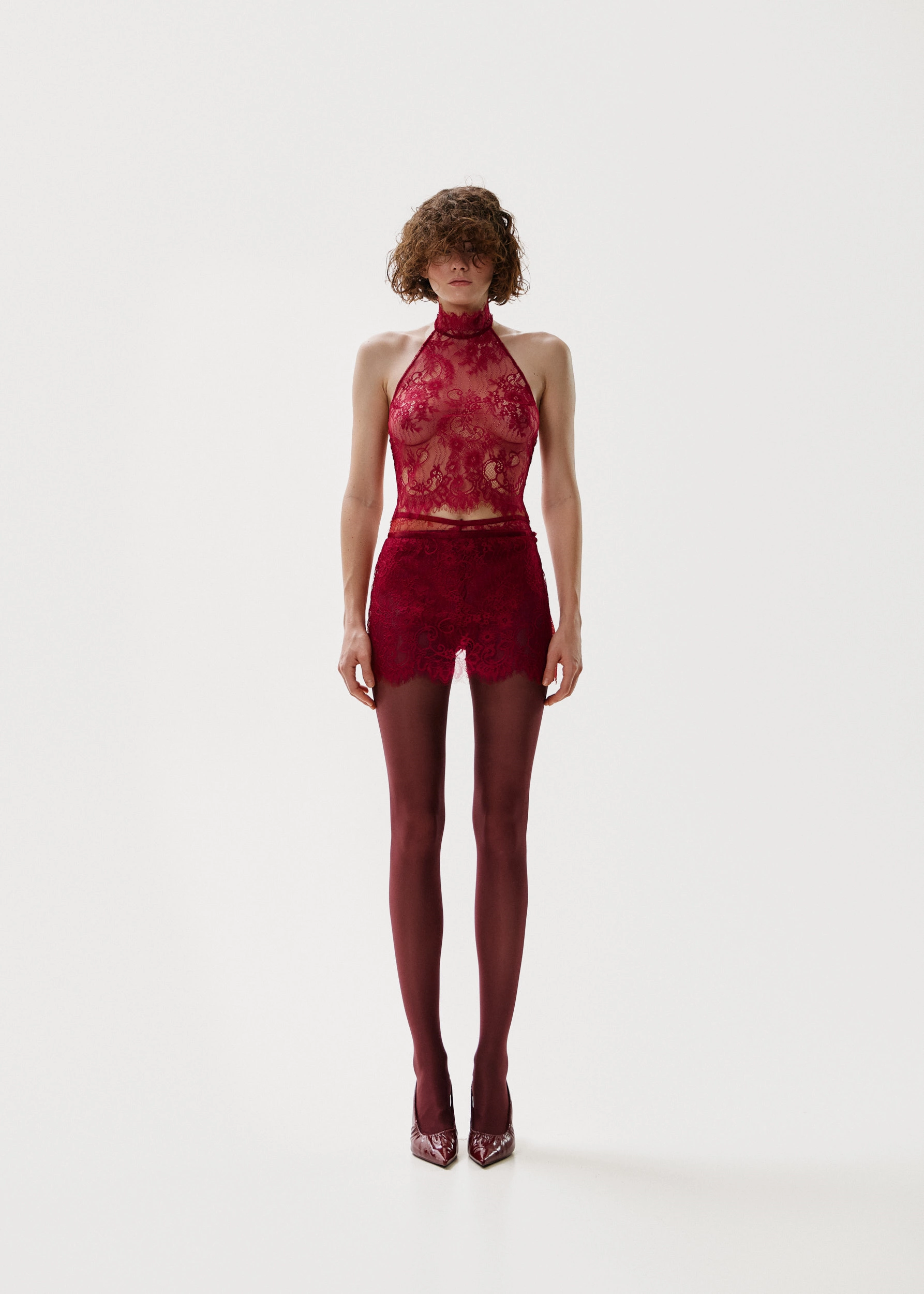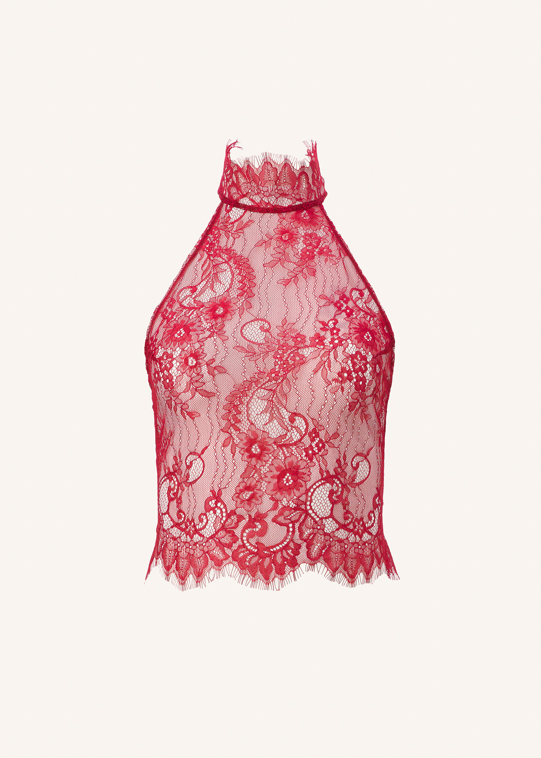Sheer lace halter-neck top in blood red, with high neck, open back, sleeveless and buttoned fastening in the back.