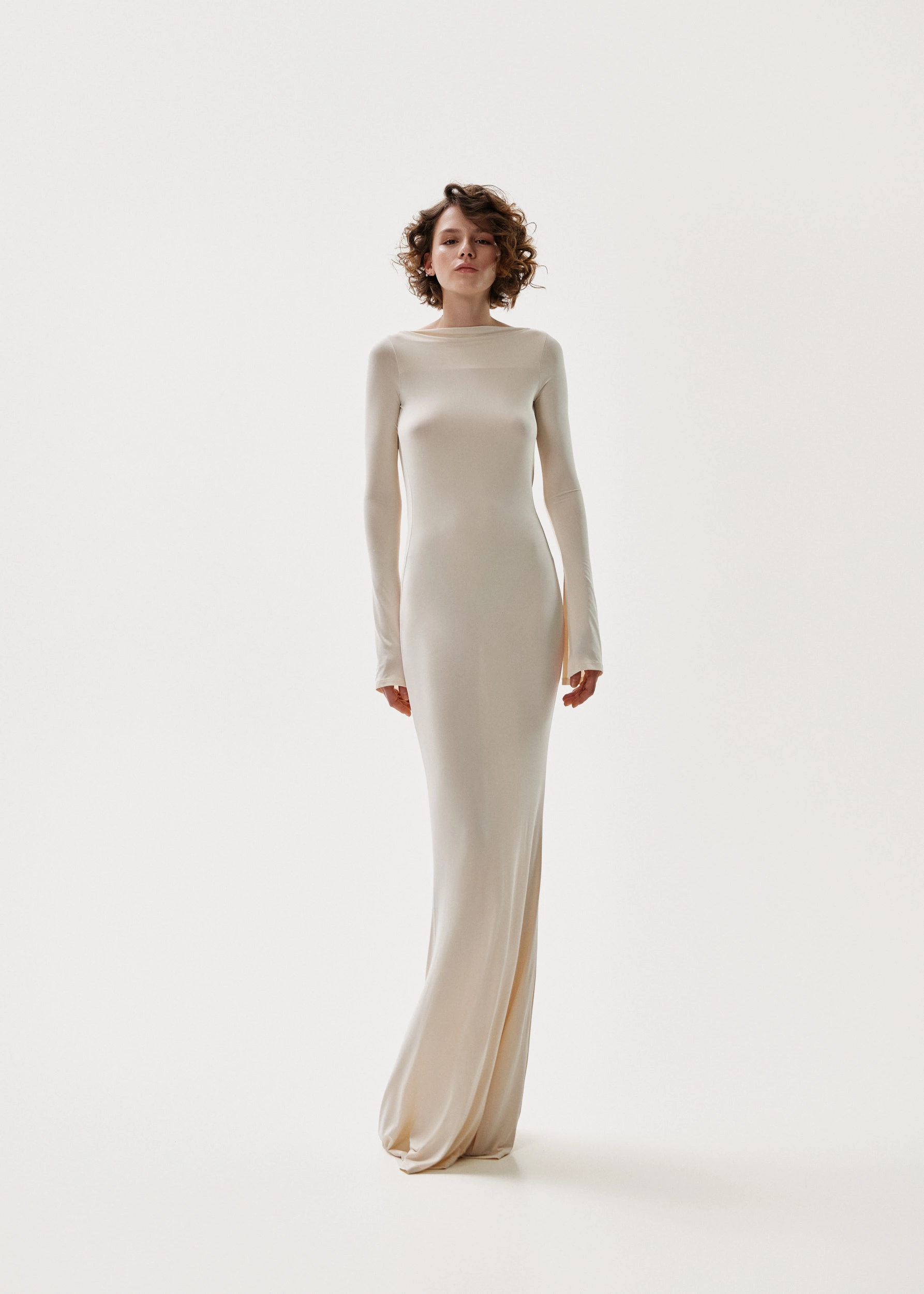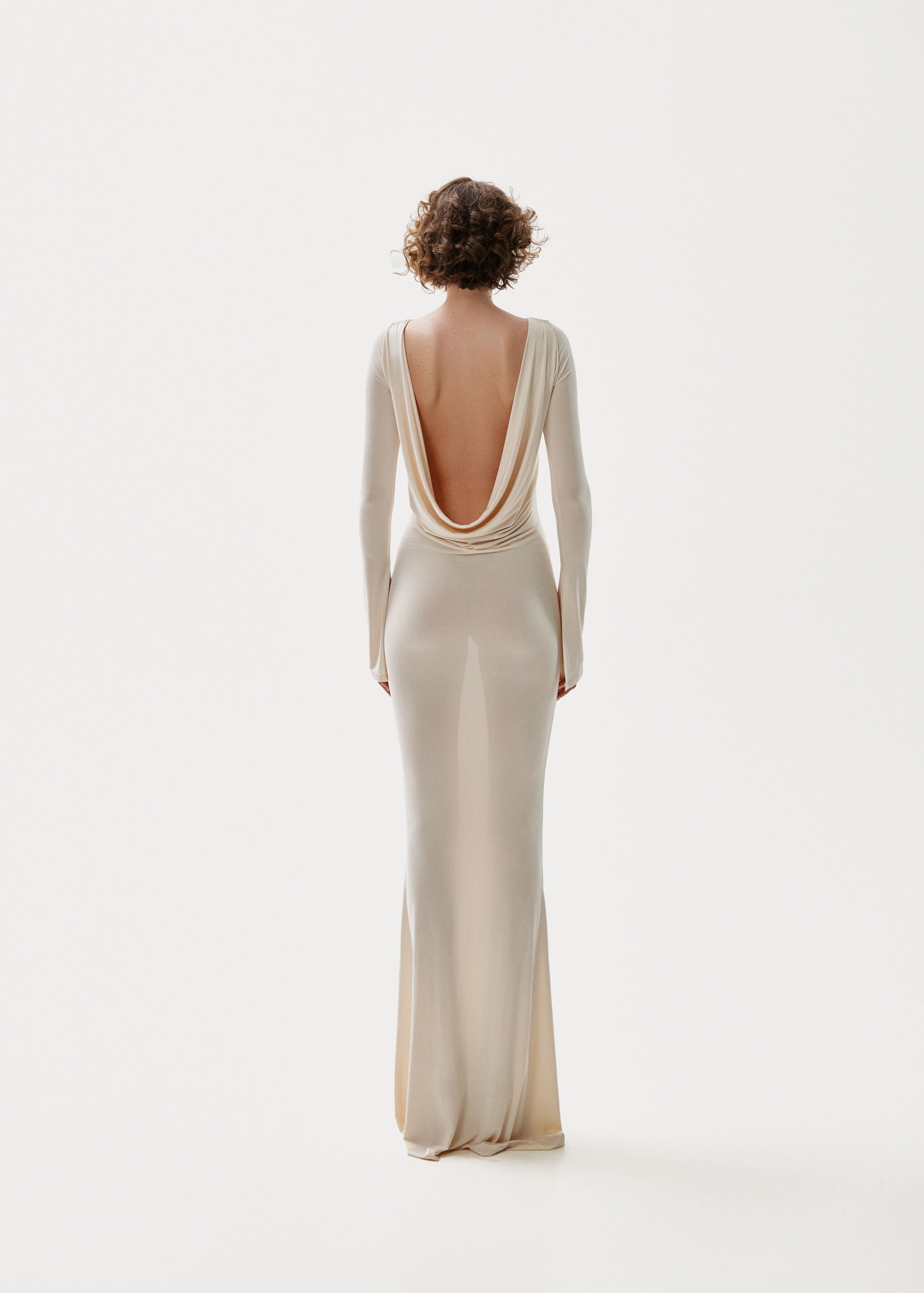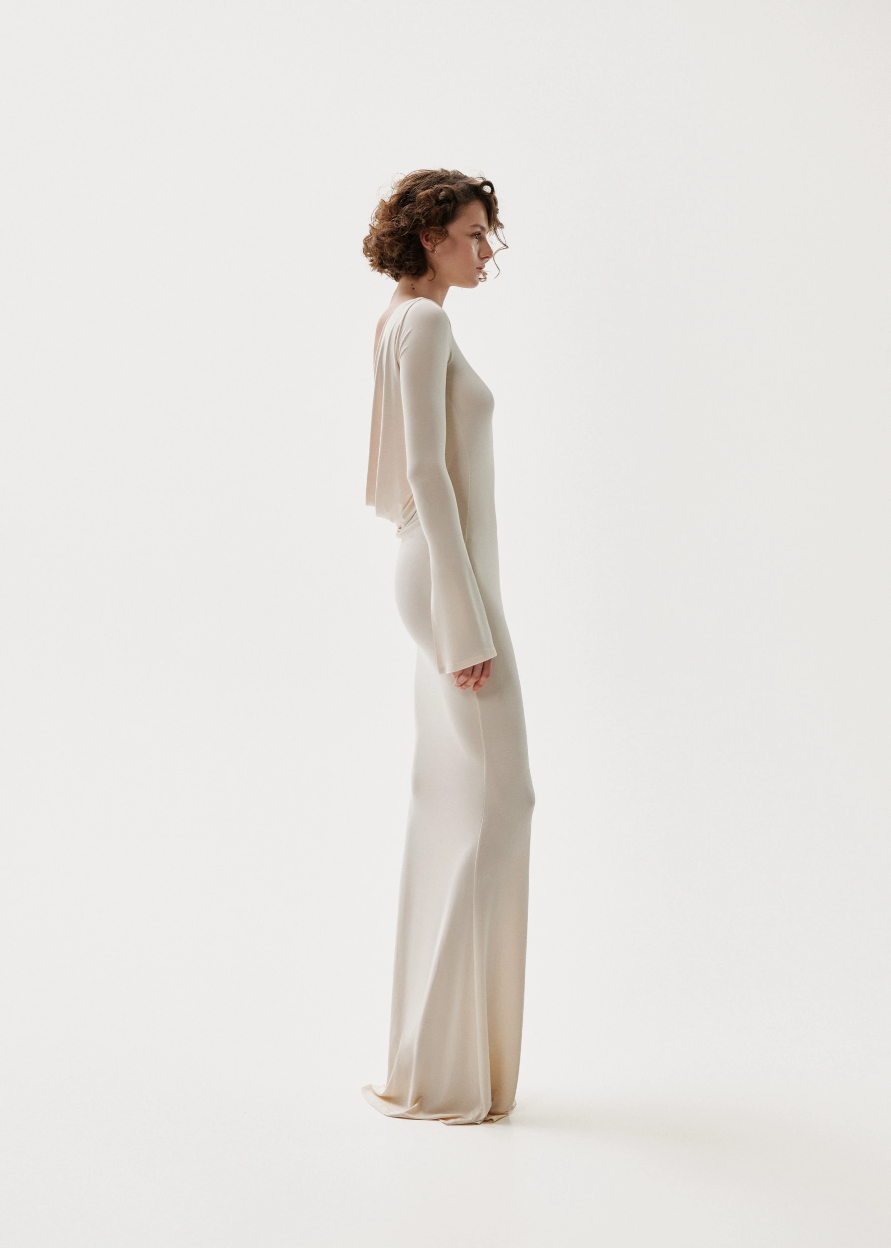 Soft knit draped open back maxi dress in milk, with boat neck, long sleeves and cowl effect to the rear. The fabric has a stretch-design, is soft and fluid.
