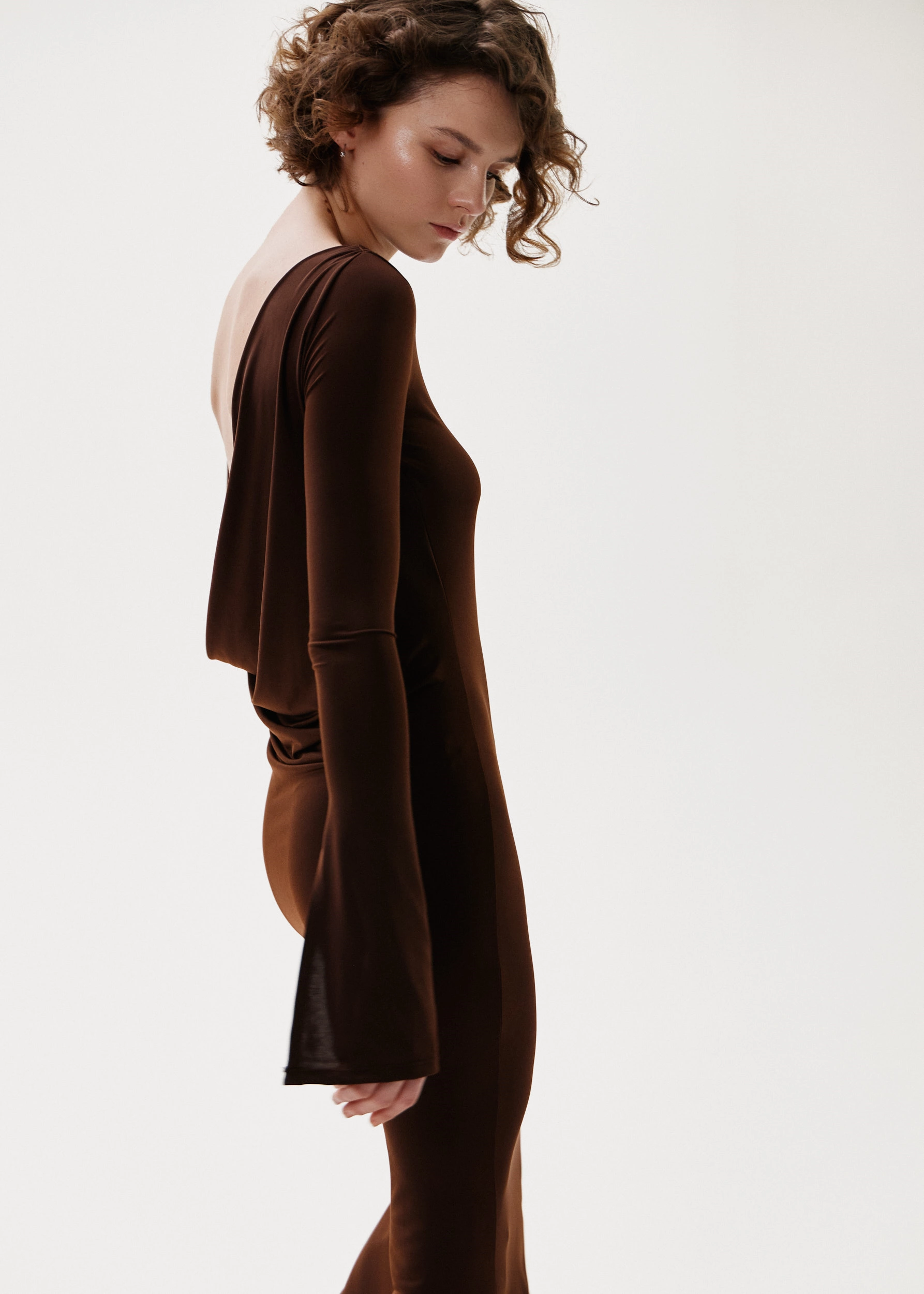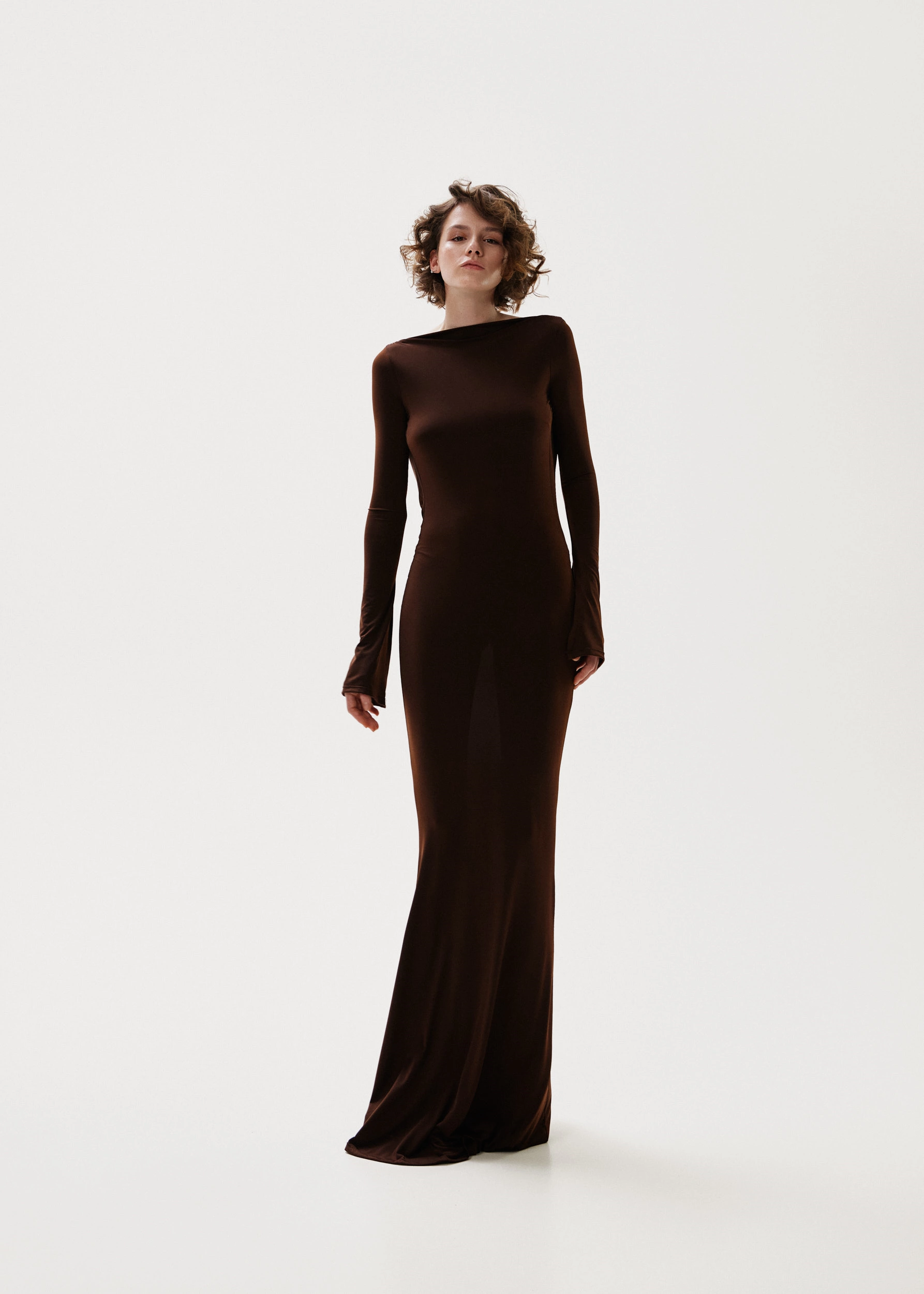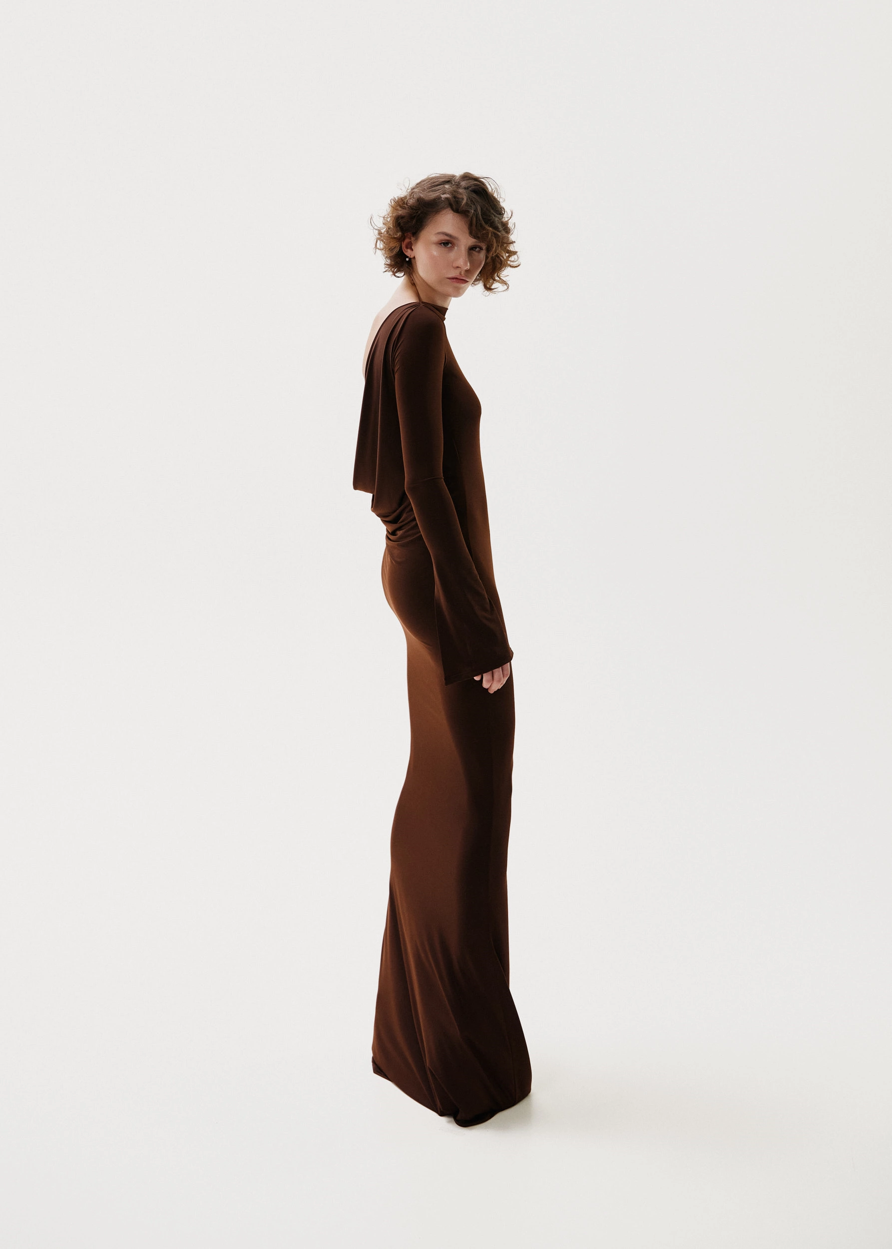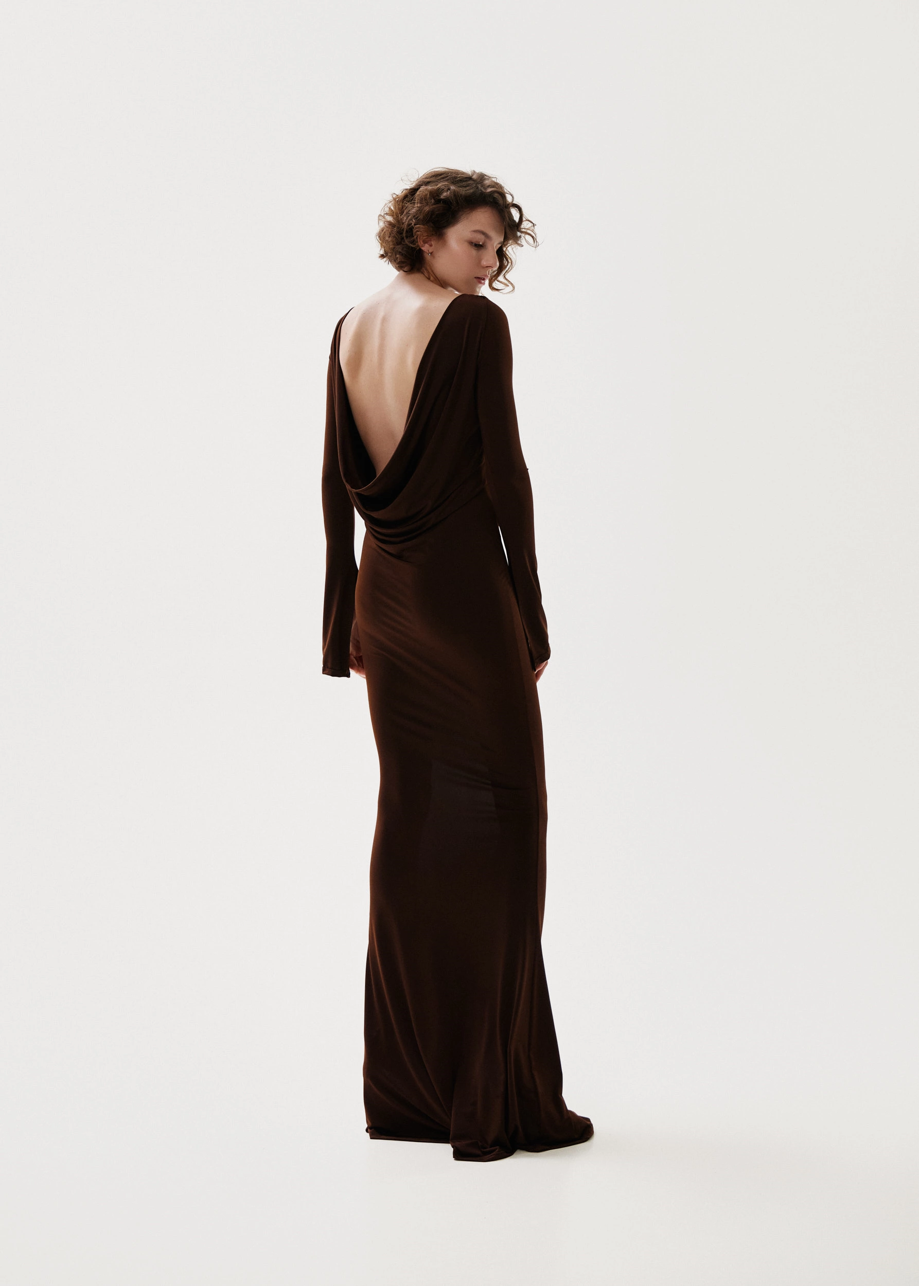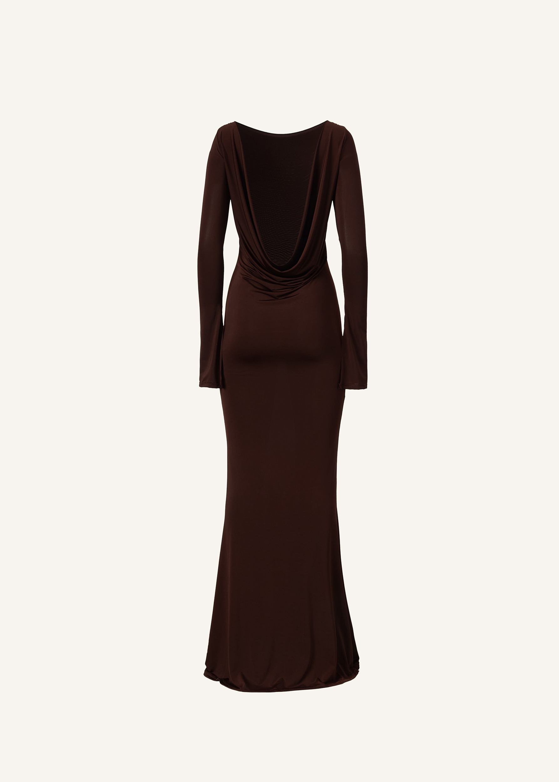 Soft knit draped open back maxi dress in umber, with boat neck, long sleeves and cowl effect to the rear. The fabric has a stretch-design, is soft and fluid.